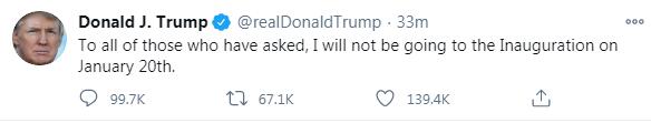 當地時間8日,美國總統特朗普發布推文宣稱:我不會出席1月20日舉行的拜登的就職典禮。