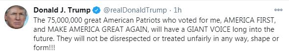 此前他還發布另一條推文稱:有75000000位偉大的愛國者投票支持我!美國第一,讓美國再次偉大!他們不會受到任何形式的不尊重或不公平的對待! ! !