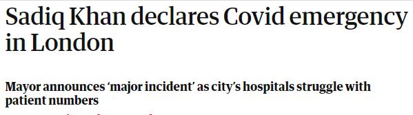 倫敦市長簡世德因應疫情加重醫療負擔,宣布全市進入重大事故狀態。簡世德指,倫敦醫院的新冠患者比4月份峰值時高出35%。