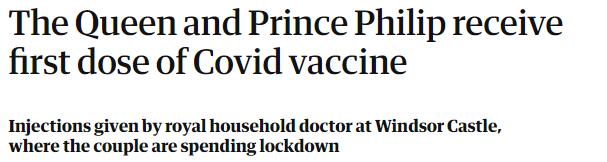 英媒:英國女王與菲臘親王接種首劑新冠疫苗