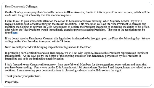 佩洛西預計,民主黨佔多數的眾議院,會通過要求免去特朗普職務的決議,如果通過後,即使彭斯沒有行動,他亦需要在24小時內回應。佩洛西稱,如果彭斯不採取行動,她將推動眾議院展開彈劾總統程序。據報已有210名眾議員支持彈劾,接近眾議院的多數。