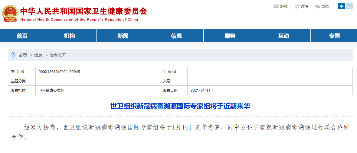 據國家衛健委11日消息,經雙方協商,世衛組織新冠病毒溯源國際專家組將於1月14日來華考察,同中方科學家就新冠病毒溯源進行聯合科研合作。