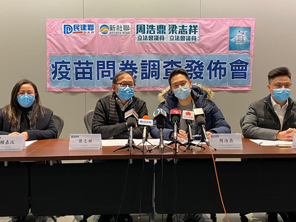 民建聯指,他們為了解社區居民對接種新冠肺炎疫苗的最新看法,在1月4日至8日以實體及網上問卷方式訪問4462位香港市民,結果顯示88.8%受訪市民表示自願接受接種新冠肺炎疫苗、83.5%受訪市民表示會選擇中國科興疫苗作為接種。