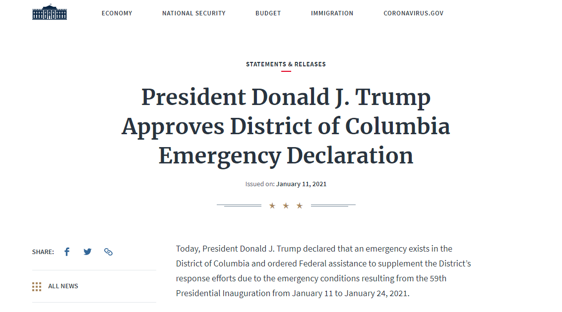 据外电报道,白宮發布聲明指,當地時間11日,美國總統特朗普批准,首都華盛頓即日起進入緊急狀態,持續至拜登就職典禮後的1月24日。美國候任總統拜登將在當地時間1月20日宣誓就職。
