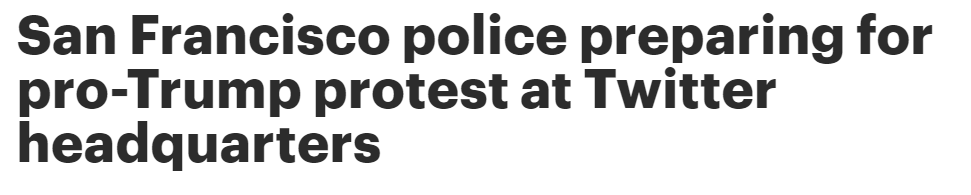 報道稱,警方並沒有透露是否出現示威者湧入相關地區的跡象,稱根據政策不能討論警方計劃。此外,一個支持特朗普的右翼論壇上有人發布內容,呼籲支持者在當地時間11日上午聚集在推特總部,並且帶上擴音器、攝像頭和塑料手銬去「逮捕煽動暴力者」。還有人建議,他們該戴口罩、墨鏡和帽子掩蓋身份。