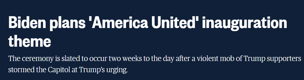當日,拜登就職典禮委員會在一份聲明中說,「在始料未及的危機和深刻分歧的時刻,『美國團結』反映了一個新的國家旅程的開始,這個旅程重塑美國的靈魂,使國家團結起來,並創造一條通往更光明未來的道路。」