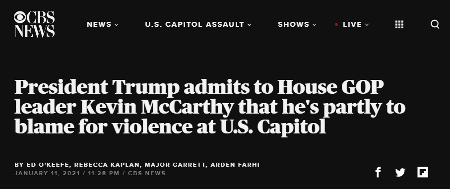 CBS報道稱,這一消息來自國會眾議院少數黨領袖凱文·麥卡錫(Kevin McCarthy)。麥卡錫當地時間周一與特朗普進行了談話,並將後者的感受傳達給了眾議院共和黨人。一些了解談話內容的共和黨人也向CBS確認了細節。