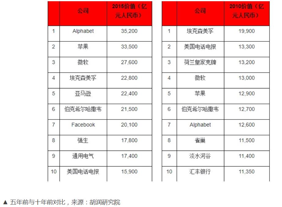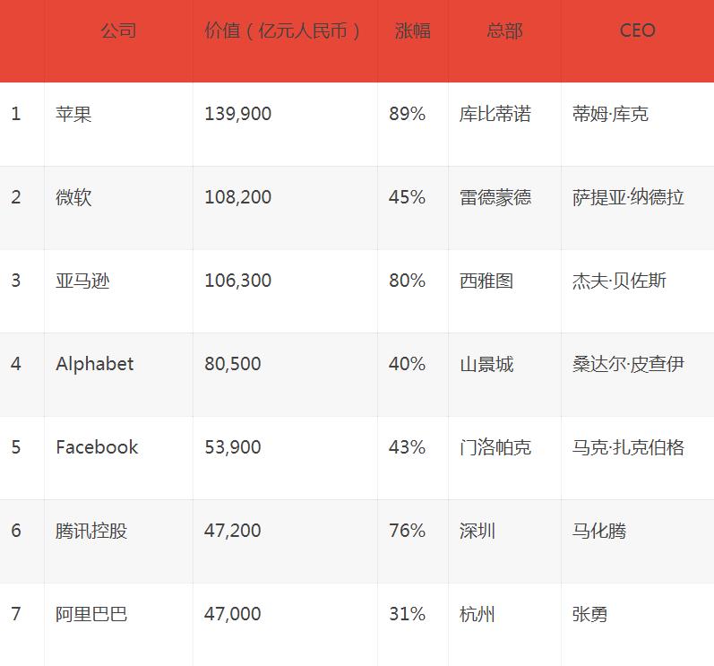 蘋果公司以14萬億元人民幣價值成為世界上最值錢的企業;其次是微軟和亞馬遜,價值均超過10萬億元。Alphabet排名第四,價值8萬億元。世界上四家價值上萬億美元的公司一年內增加了17萬億元,相當於印度GDP,總價值達到44萬億元,佔「胡潤世界500強」的13%。