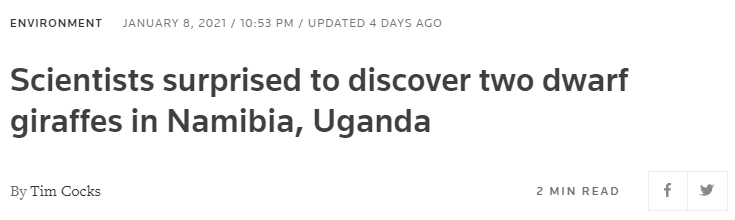 報道稱,非洲國家納米比亞和烏干達均發現了迷你長頸鹿,身高在2.6米左右,約為長頸鹿正常身高(4.6米至6.1米)的一半,這也是全球首次發現迷你長頸鹿。