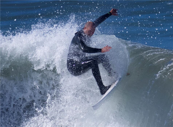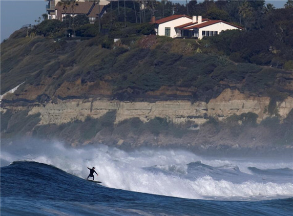 当地时间1月11日,美国加利福尼亚州卡迪夫海滩,当巨浪向加州海岸线袭来时,一些冲浪爱好者乘势冲浪,既惊险又刺激,好不快哉!(图源:路透社)
