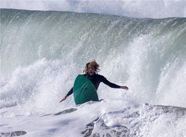 一名冲浪者在巨浪袭来时勇立潮头。