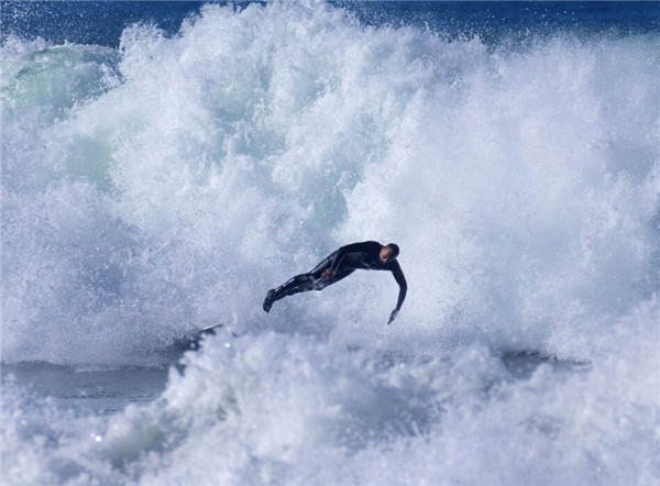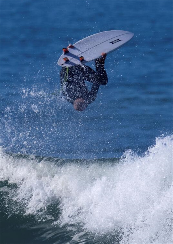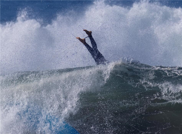 巨浪扑来,冲浪者瞬间飞离浪头。