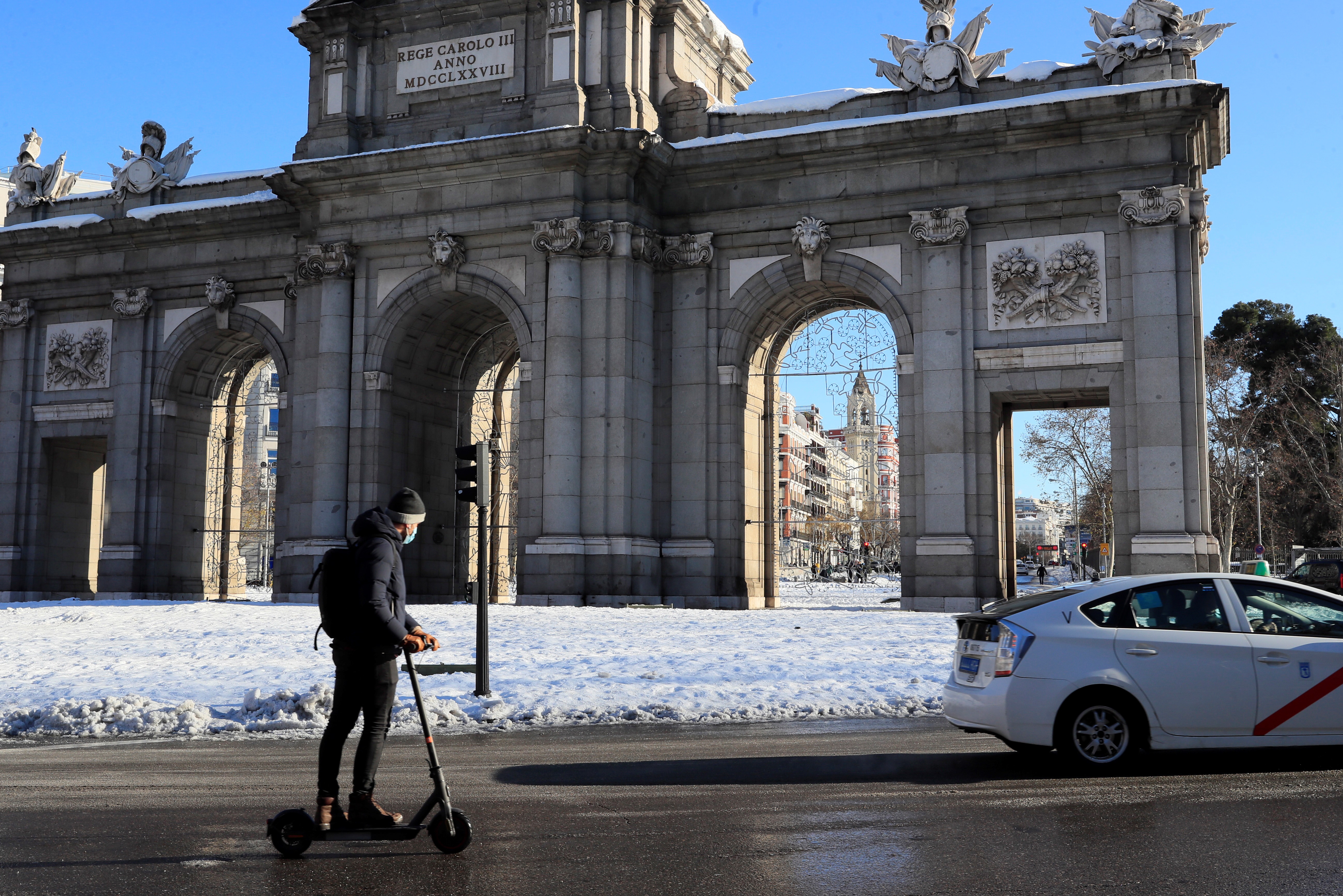 1月11日,在西班牙馬德里,一名男子騎滑板車從阿爾卡拉門前經過。
