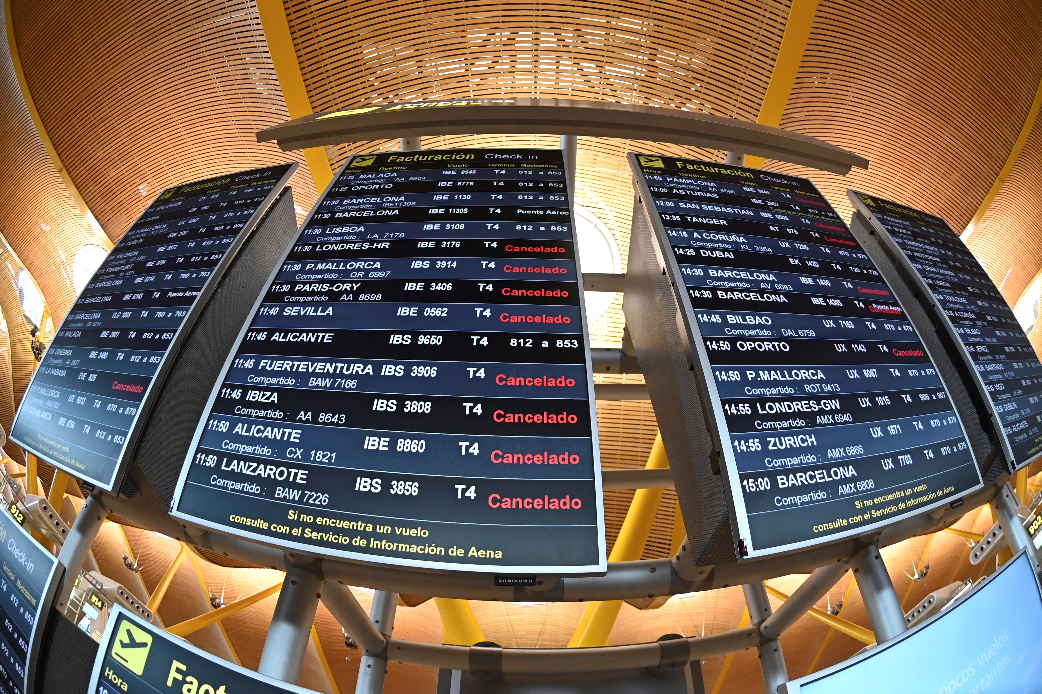 1月11日,西班牙馬德里阿道弗•蘇亞雷斯-巴拉哈斯國際機場的電子顯示屏顯示被取消的航班信息。