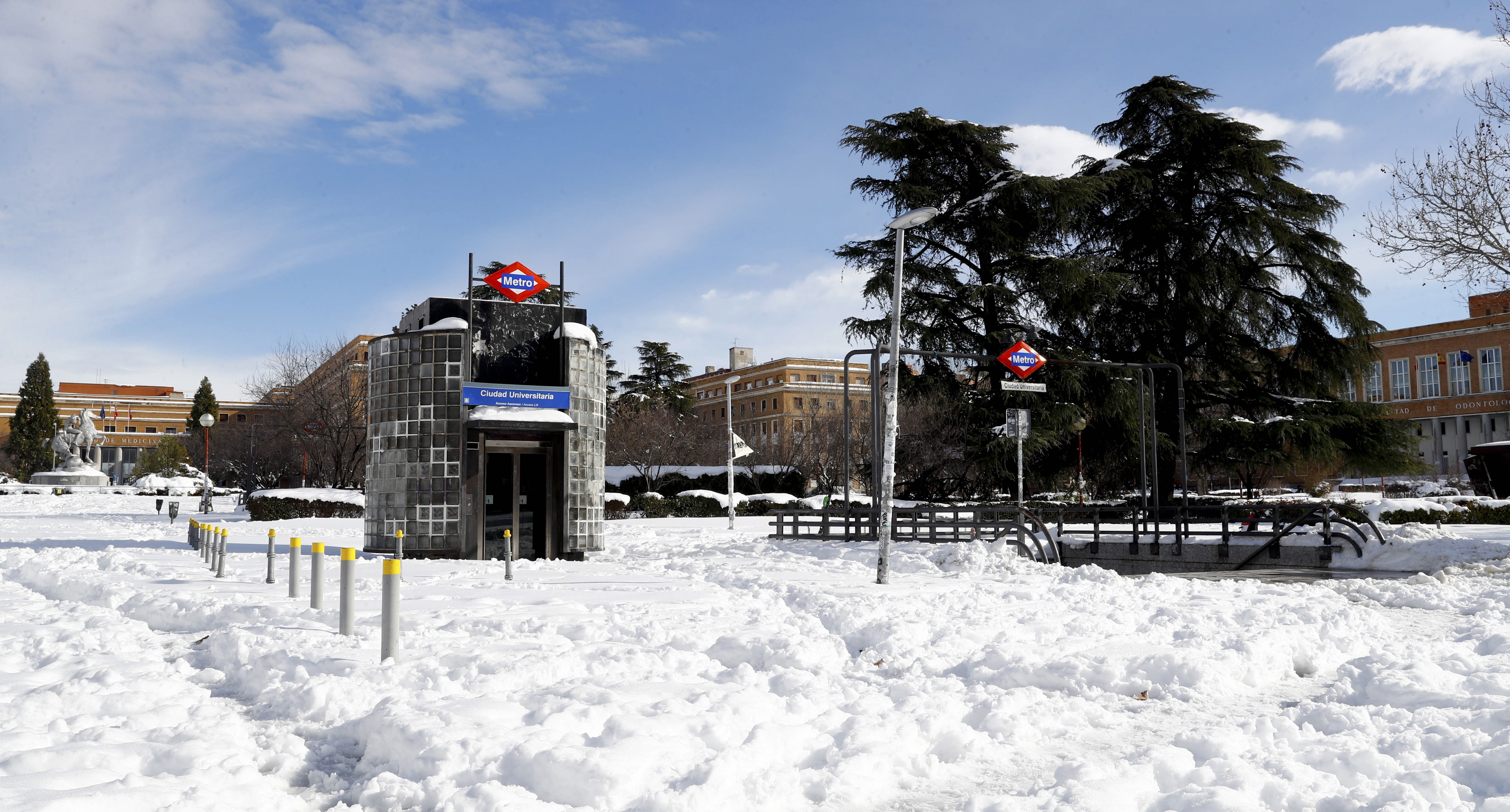 1月11日,西班牙馬德里康普頓斯大學內的地鐵站入口的積雪