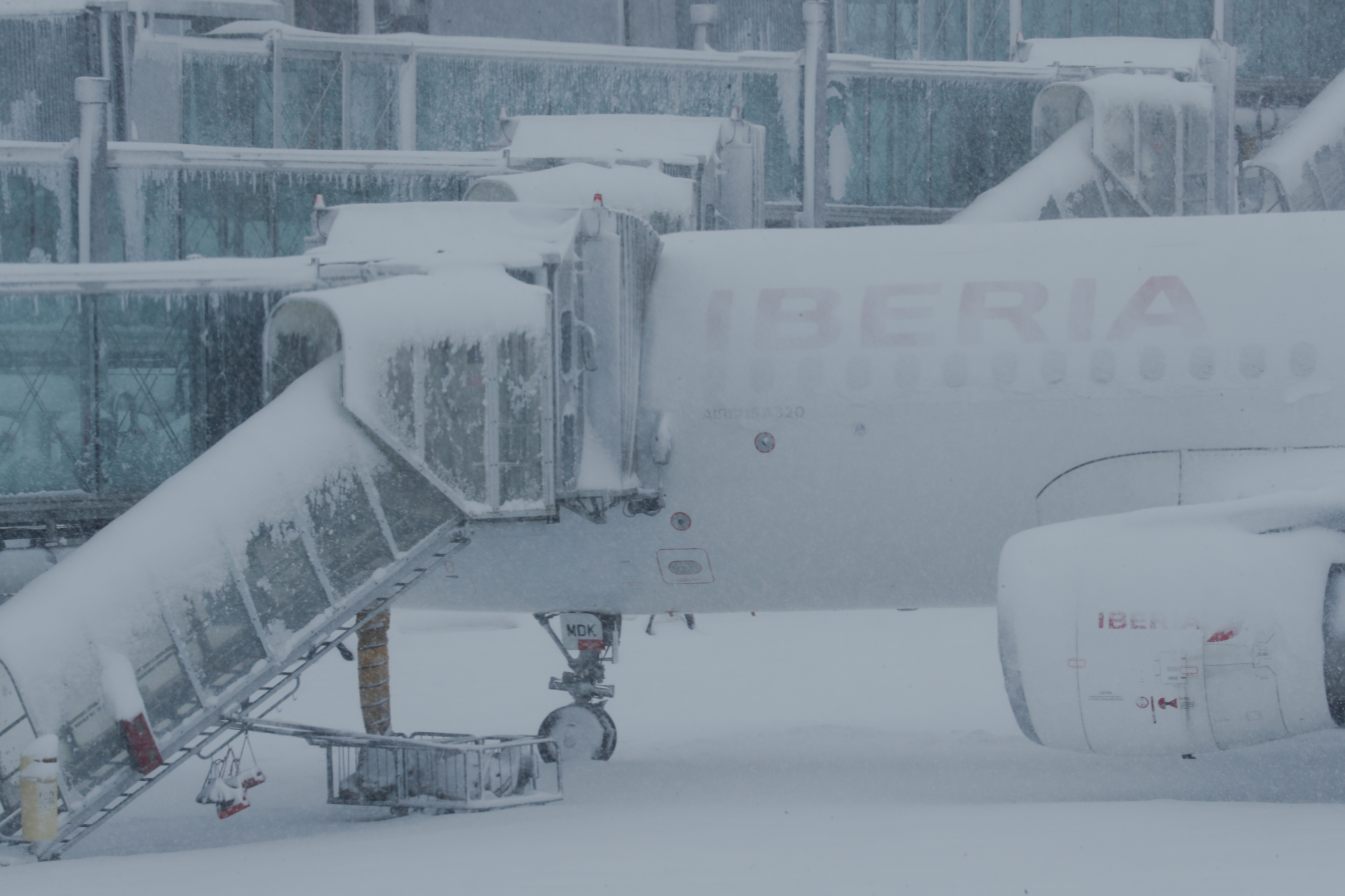1月9日,西班牙馬德里阿道夫·蘇亞雷斯·巴拉哈斯機場一架停放的飛機被大雪覆蓋,由於大雪,該飛機暫停了航班。路透社 Susana Vera