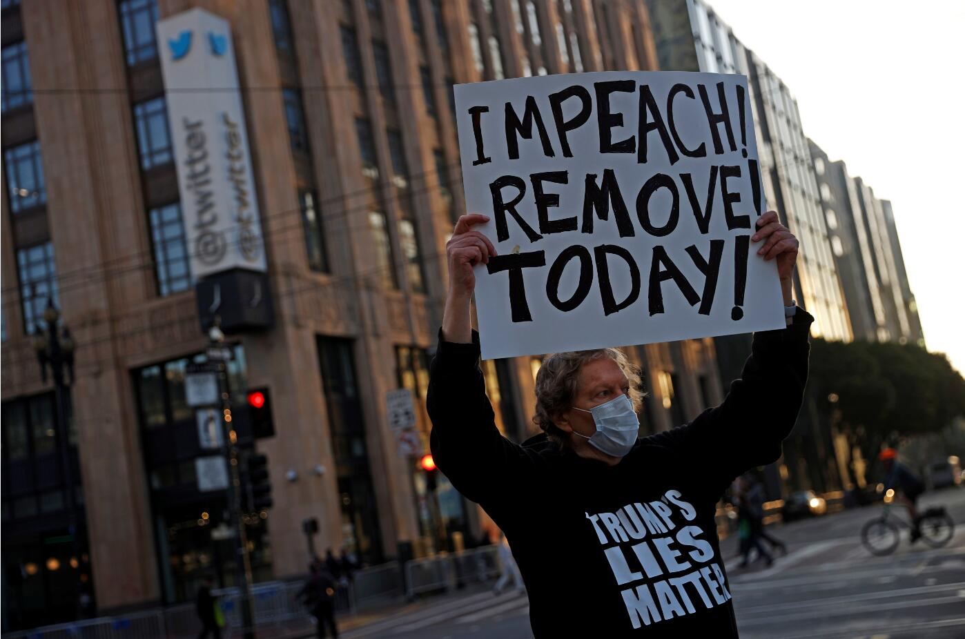 在加州三藩市,有特粉在推特總部外示威,抗議推特封鎖特朗普的帳號。路透社