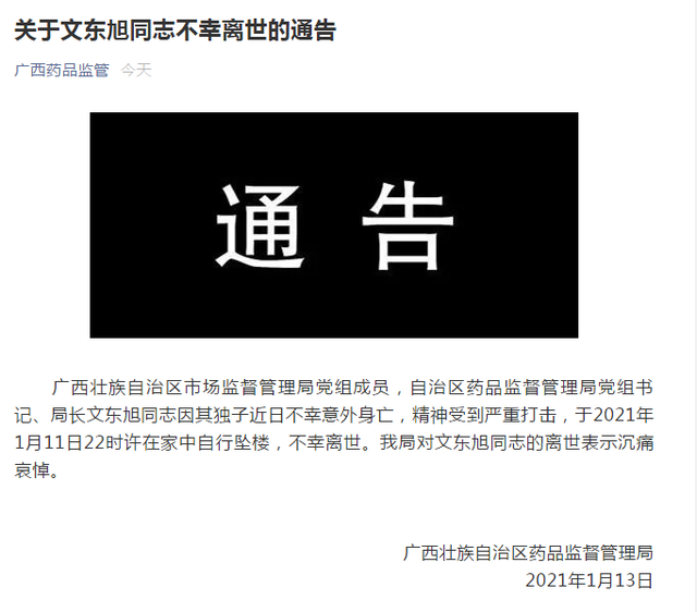 通報內容顯示,文東旭同志因其獨子近日不幸意外身亡,精神受到嚴重打擊,於2021年1月11日22時許在家中自行墜樓,不幸離世。廣西壯族自治區藥品監督管理局對文東旭同志的離世表示沉痛哀悼。