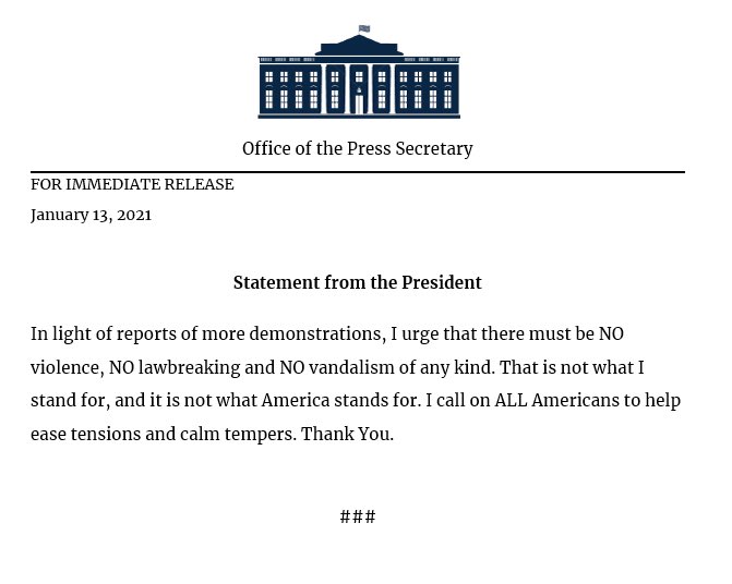 14日,在美國國會眾議院通過特朗普彈劾案後,白宮推特賬號發布了一段總統特朗普的視頻。在視頻中,特朗普沒有提及遭到二次彈劾一事,而是聚焦於譴責暴力。他表示,「我明確譴責我們上周所目睹的暴力(行徑)。」