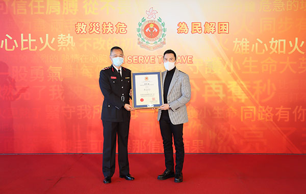 消防處處長梁偉雄於儀式上頒授「香港消防處國際形象大使」委任狀予甄子丹
