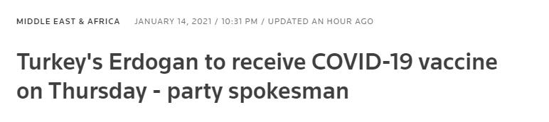 土耳其周三批准緊急使用中國科興控股生物技術有限公司生產的新冠肺炎疫苗,衛生部長科賈隨即於當天晚上率先接種,由電視直播,同時接種的還有應對新冠疫情的科學委員會成員。