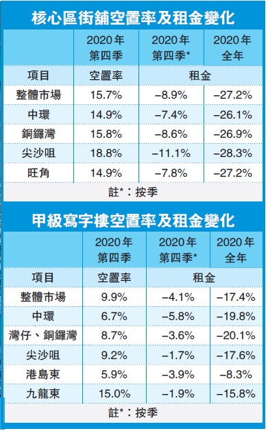 本港經濟及地產市場受到中美貿易糾紛、本地社會衝突及環球新冠肺炎疫情嚴重影響,儘管未來一年前景仍然充滿挑戰,尤其是首6個月,但世邦魏理仕認為,隨着香港疫苗接種計劃推出後,疫情將受控,跨境人流漸恢復,市場重拾營商信心,料各核心區的甲級寫字樓租金今年僅再跌5%,年內購物區街舖的租金跌幅亦會較去年溫和,料跌5%至10%。