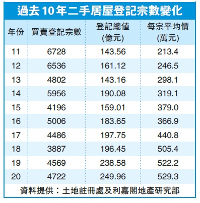 經濟轉差,資金流向自由市場居屋,2020年二手居屋錄4722宗買賣登記,居屋成交總值再次創下自1996年有紀錄以來最多,反映港人對住屋需求依然殷切。