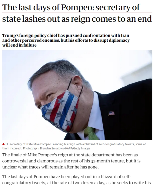 《衛報》周四的一篇評論文章指出,蓬佩奧在國務院最後的日子,一如既往,充滿爭議與喧囂。