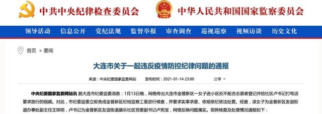 據中央紀委國家監委網站消息,大連市紀委監委消息稱,1月13日晚,網絡傳出大連市金普新區一女子進小區拒不配合志願者登記並給社區盧書記打電話要求放行的視頻。對此,市紀委監委立即責成金普新區紀檢監察工委進行核查,並要求實事求是、依規依紀依法處置。經查,該女子為金普新區友誼街道辦事處副主任王琛明,盧書記為金普新區友誼街道康樂社區黨委副書記盧憲寶,網絡反映問題屬實。現將核查及處理情況通報如下:
