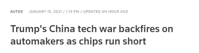 日前全球各地多家汽車公司的生產線因為芯片供應短缺而停產。路透社15日發表文章指,據業內高管透露,某種程度上,正是因為特朗普政府對中國主要芯片企業的制裁惡化了這種局面。