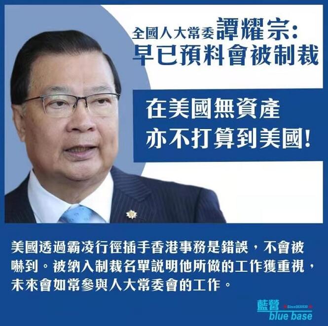 譚耀宗表示,早已預料會被「制裁」,重申他在美國並無資產,亦不打算到美國。他指,被納入「制裁」名單說明他所做的工作獲重視,未來會如常參與全國人大常委會的工作。
