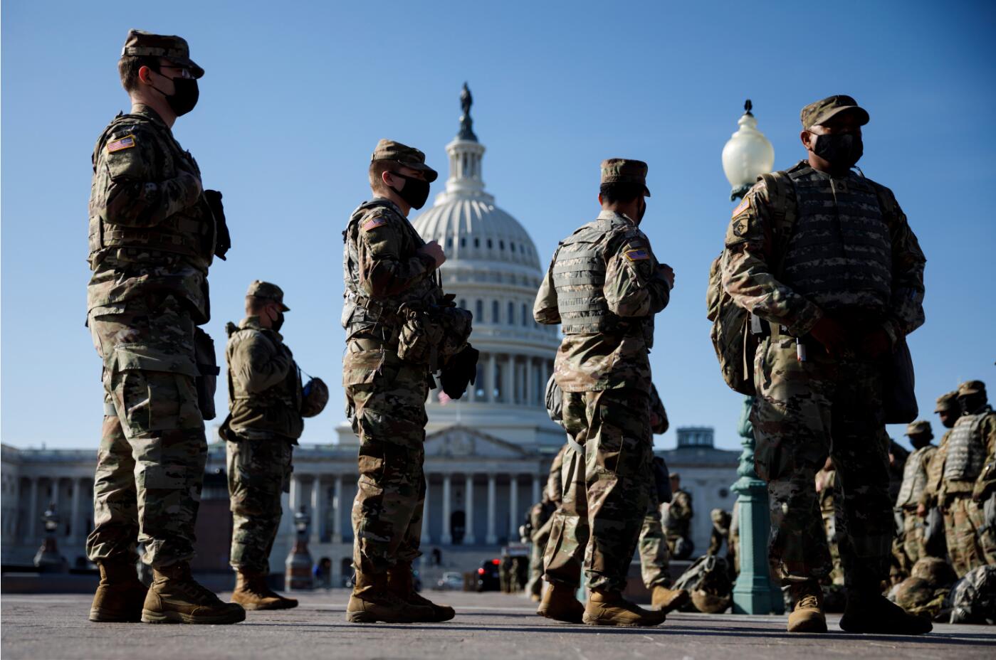圖為14 日美國國會大廈前的美國國民警衛隊士兵。新華社