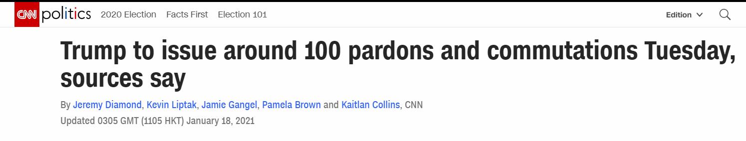 CNN援引三名知情人士透露,美國總統特朗普準備在當地時間周二(19日),也就是他就職的最後一天發布大約100份赦免令和減刑令。