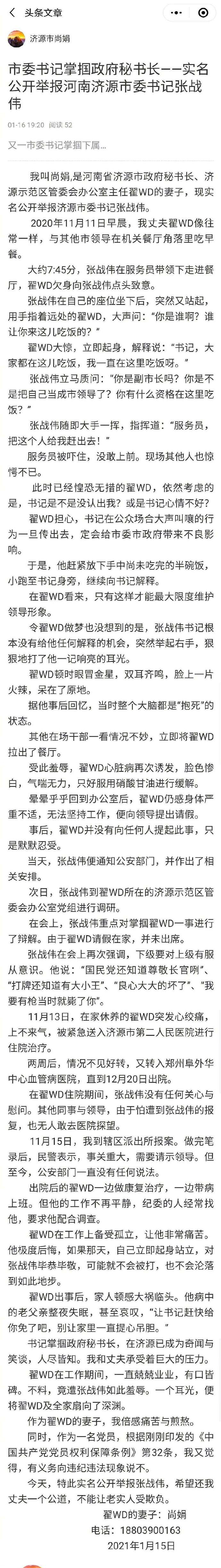 據楚天都市報18日上午消息,1月16日,微博博主「濟源市尚娟」發帖,實名公開舉報河南濟源市委書記張戰偉。在帖子中,尚娟稱她是河南省濟源市政府秘書長、濟源示範區管委會辦公室主任翟偉棟的妻子,去年11月11日早晨,翟偉棟與其他市領導在機關餐廳角落裏吃早餐時,被河南濟源市委書記張戰偉掌摑。尚娟在帖子中還稱,此事誘發了翟偉棟的心臟病。18日上午,記者撥打河南省紀委12388熱線,工作人員表示,此前已經有人反映該問題。
