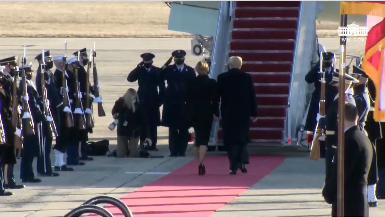 [21:43] 特朗普抵達安德魯斯空軍基地,謝幕儀式開始。據美媒消息,特朗普和梅拉尼婭乘坐的陸戰隊一號剛剛抵達安德魯斯空軍基地,他的家人早已在此等候,隨後,特朗普舉行一個簡短的卸任儀式。