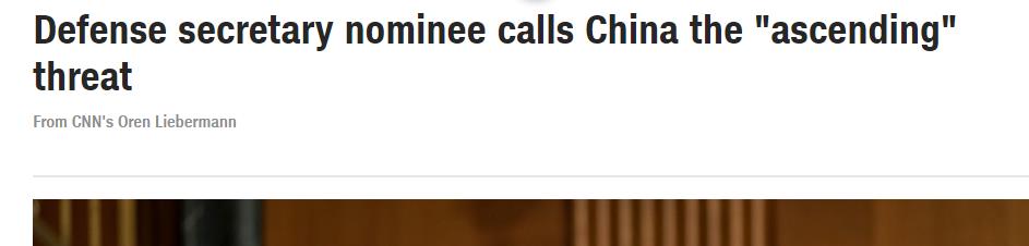 據CNN報道,奧斯汀在提名听证会上稱中國是美國面臨的「最大威脅」。67歲的奧斯汀是前中央司令部司令,但由於未符合退役至少7年才能執掌國防部的規定,需要獲會豁免。
