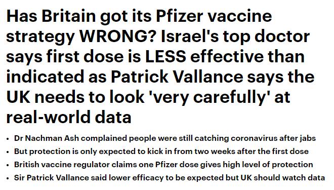 以色列目前要求新冠疫苗接種第一劑和第二劑之間的給藥時間不得超過三周,而此前英國決定將第一劑和第二劑之間的間隔時間從三周延長至十二周。