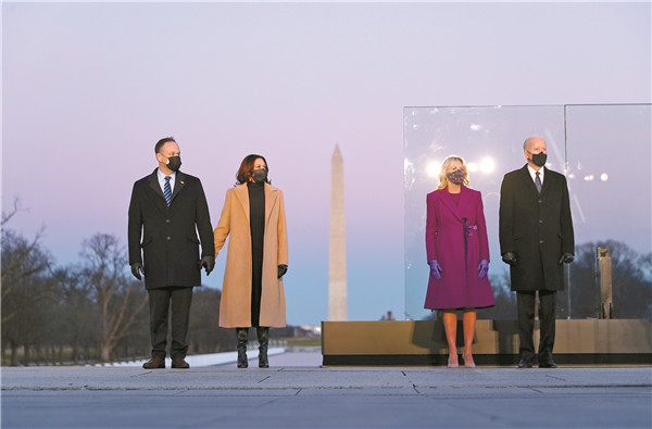 當地時間周二,拜登夫婦和賀錦麗夫婦在林肯紀念堂 前悼念40萬新冠疫歿者。 路透社
