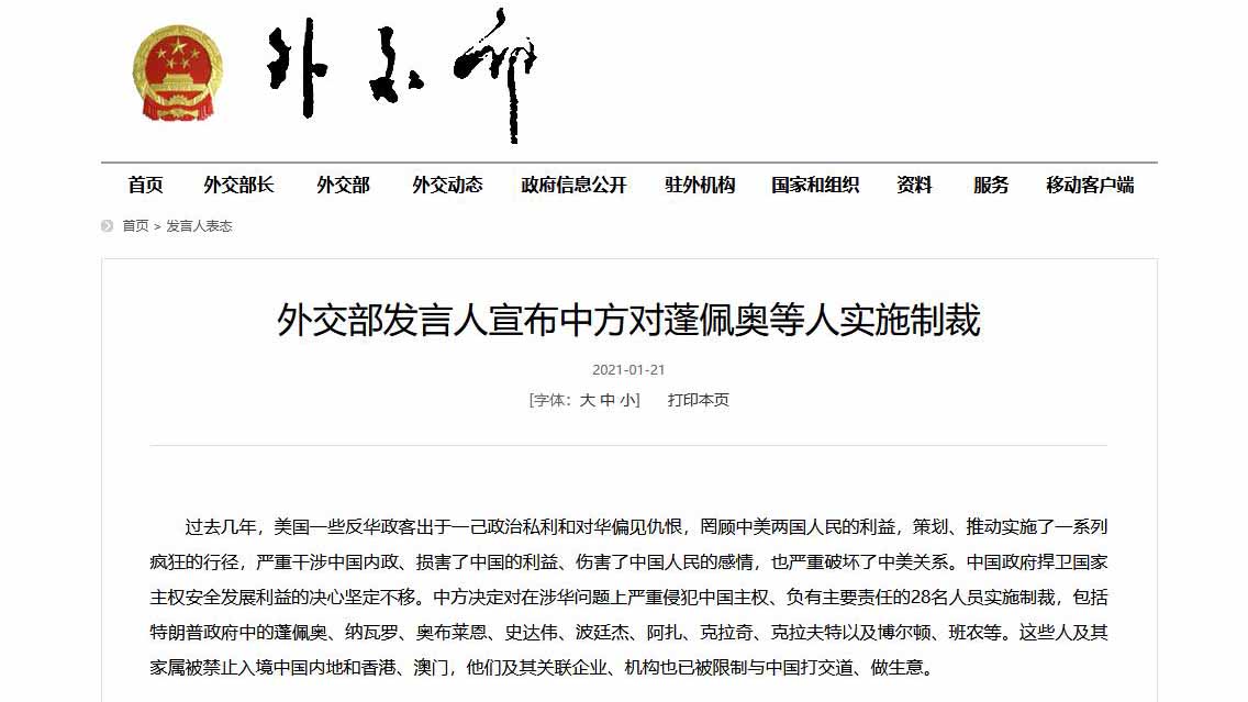 1月21日,外交部發言人表示,過去幾年,美國一些反華政客出於一己政治私利和對華偏見仇恨,罔顧中美兩國人民的利益,策劃、推動實施了一系列瘋狂的行徑,嚴重干涉中國內政、損害了中國的利益、傷害了中國人民的感情,也嚴重破壞了中美關係。中國政府捍衛國家主權安全發展利益的決心堅定不移。中方決定對在涉華問題上嚴重侵犯中國主權、負有主要責任的28名人員實施制裁,包括特朗普政府中的蓬佩奧、納瓦羅、奧布萊恩、史達偉、波廷傑、阿紮、克拉奇、克拉夫特以及博爾頓、班農等。這些人及其家屬被禁止入境中國內地和香港、澳門,他們及其關聯企業、機構也已被限制與中國打交道、做生意。