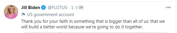 吉爾拜登還在推文中感謝美國人民致力於創建一個更美好世界的信念,並表示將為之共同奮進。(編譯:徐浩 圖源:路透社)