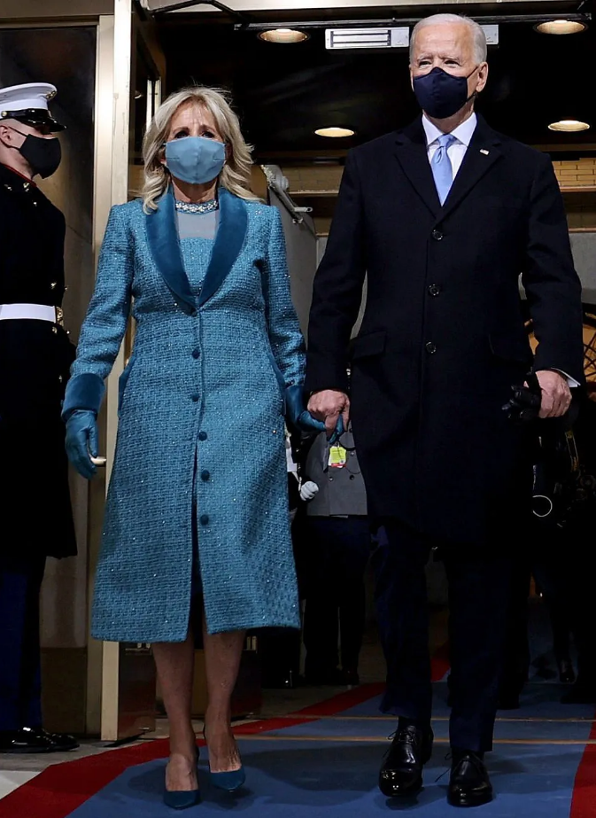 就職典禮上男士多以莊重黑色西裝大衣出席, 拜登與妻子吉爾的著裝都有藍色,其實是代表著「信任」,也有穩定、自信之意,所以用這套服裝寄托能得到選民們信任的期盼。