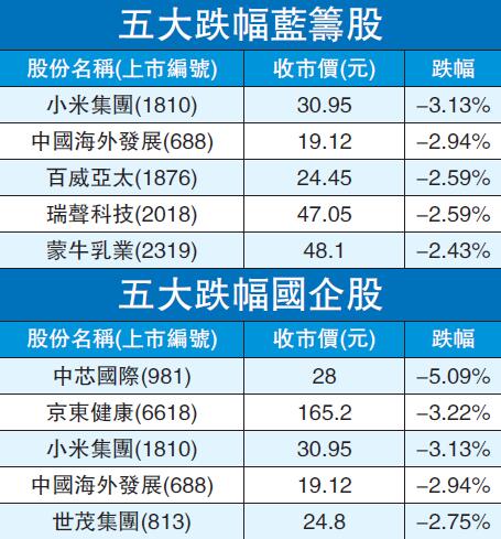 內地強化支付領域反壟斷監管措施,阿里(9988)跌2.4%;小米(1810)跌3.1%,為表現最差藍籌;阿里健康(241)創新高後,回吐2.6%;京東健康(6618)吐3.2%。京東(9618)和美團(3690)則創新高,收市升1.6%和0.9%。