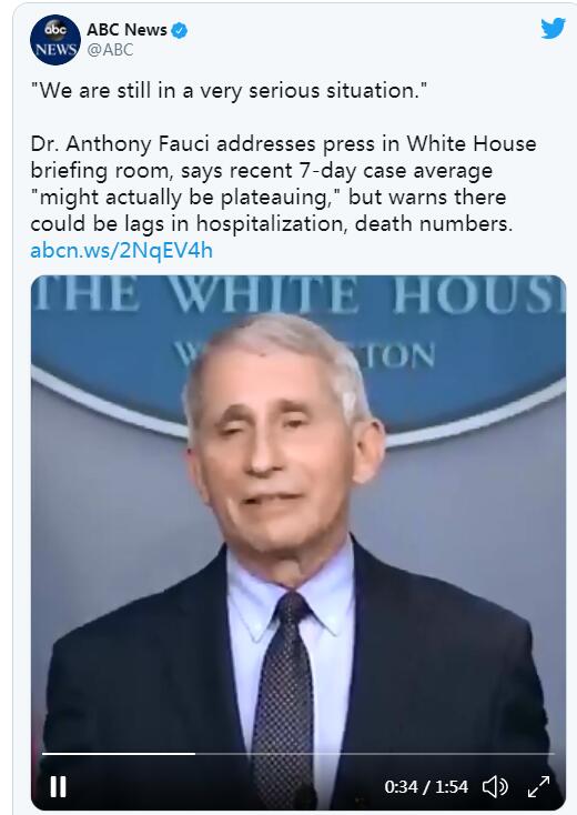 福奇當天在白宮新聞簡報室向媒體發表講話說,最近7天的平均病例數「實際上可能會趨於平穩」,但他警告說,住院治療和死亡數字可能會滯后。