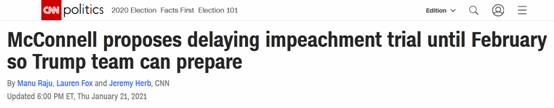 美國有線電視新聞網(CNN)援引共和黨議員說法稱,參議院共和黨領袖麥康奈爾21日提議參議院給前總統特朗普的法律團隊兩周時間,為即將到來的彈劾審判做準備,並將彈劾審判推遲到2月份。