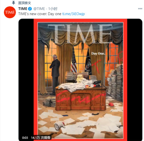 美國《時代》周刊更是在官方推特上更新了一張動畫版封面圖,封面显示,一位酷似拜登的白发老人站在白宮辦公室,窗外不時有火光顯現,而他身後的檔積壓如山,還有不少紙張散落一地,場面一片混亂。《時代》周刊在封面上還寫著「第一天」(Day One)的字樣,以此顯示拜登就職總統後第一天所面臨的混亂局面。
