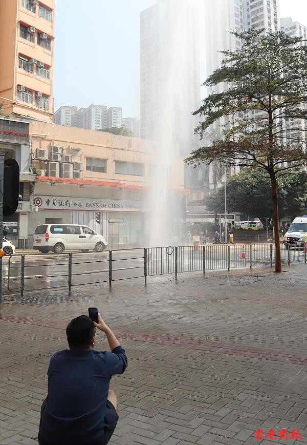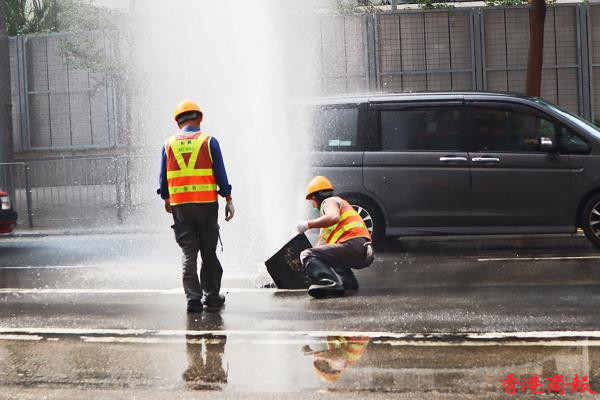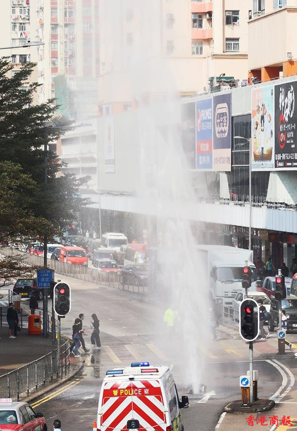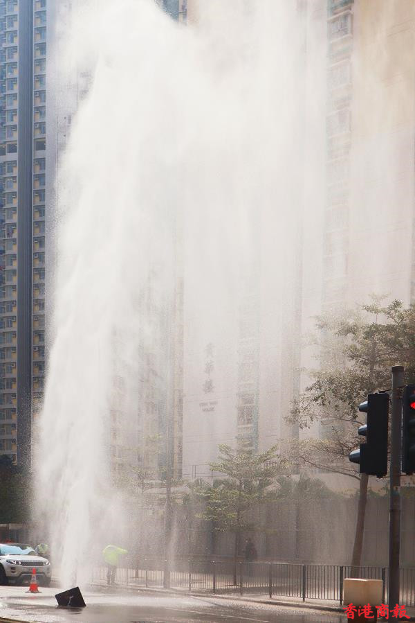 今午(22日)牛頭角道淘大花園對著的馬路有水管爆裂,大量食水沖開渠蓋射出,水柱高達二十多米,路過的汽車都被清洗,交通受阻,水務署已派人搶修。