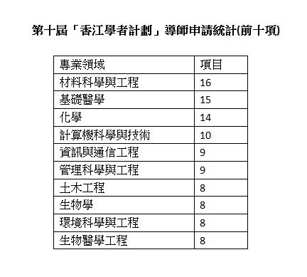 剛截止申請的第十屆「香江學者計劃」,吸引逾180名本港教授報名出任導師,涉及45個專業領域。按申請數目排列,「材料科學與工程」以16項高踞榜首,「基礎醫學」以15項次之,排第三是「化學」的14項,「計算機科學與技術」則有十項。