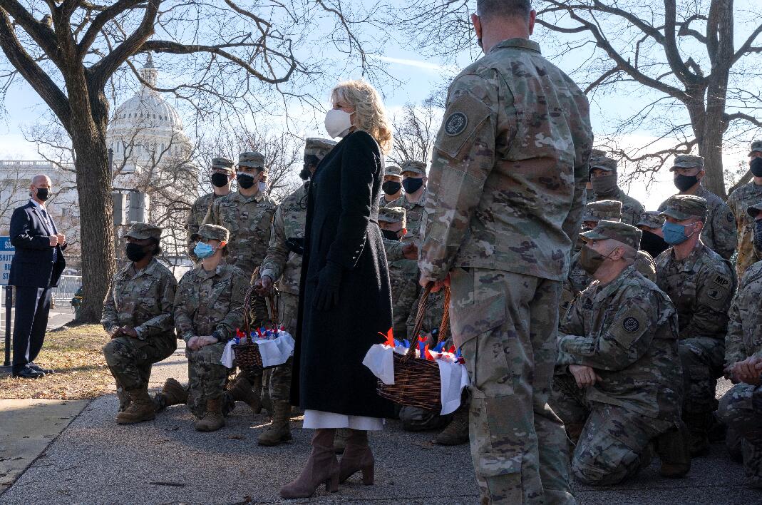 吉爾拜登突然造訪國民警衛軍,並對他們表示感謝。她還提到拜登的兒子博拜登曾在國民警衛軍服役,表示國民警衛軍在所有拜登家族成員的心中永遠佔據著特殊的位置。吉爾拜登還帶去了白宮烘焙的巧克力點心作為禮物。