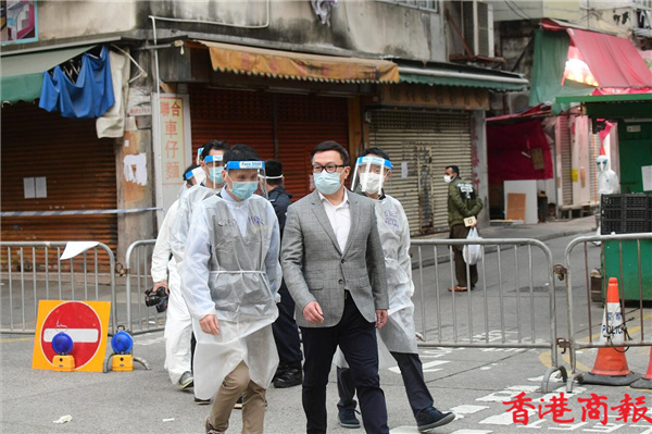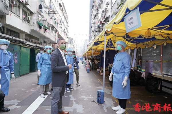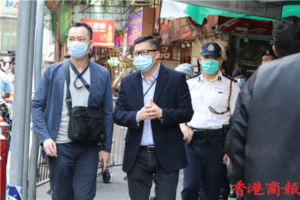 多名紀律部隊首長下午先後到政府圍封的佐敦四街範圍內視察,包括警務處處長鄧炳強、海關關長鄧以海、入境處處長區嘉宏、懲教署署長胡英明等。鄧以海視察後表示,現場有很多舊樓,實際行動不容易,要動員很多人手處理,指今次在短時間內召集人手,紀律部隊的參與是義之所在,海關亦立即調動人員參與行動,支持政府抗疫,並希望可以協助在社區中尋找到更多隱形患者。鄧以海又指,今次幾個紀律部隊合作得非常好,溝通充足,劃分區域各自參與工作,而關員亦反映區內居民非常合作及平和,相信今次行動可以順利進行。