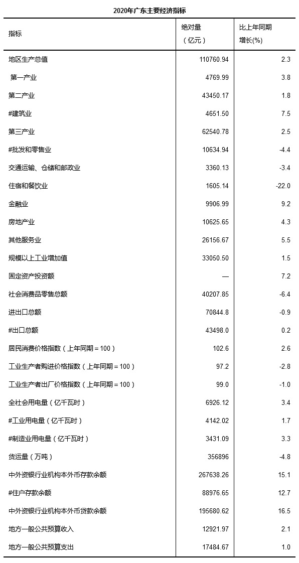 1月24日,廣東省統計局發布數據,2020年廣東省地區生產總值110760.94億元,同比增長2.3%。全年經濟總量超11萬億元,連續32年居全國首位,同比增速與全國同步。